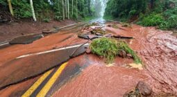 Lama arrastada pela chuva arranca parte do asfalto e interdita trecho da PR-182 entre Umuarama e Ivaté